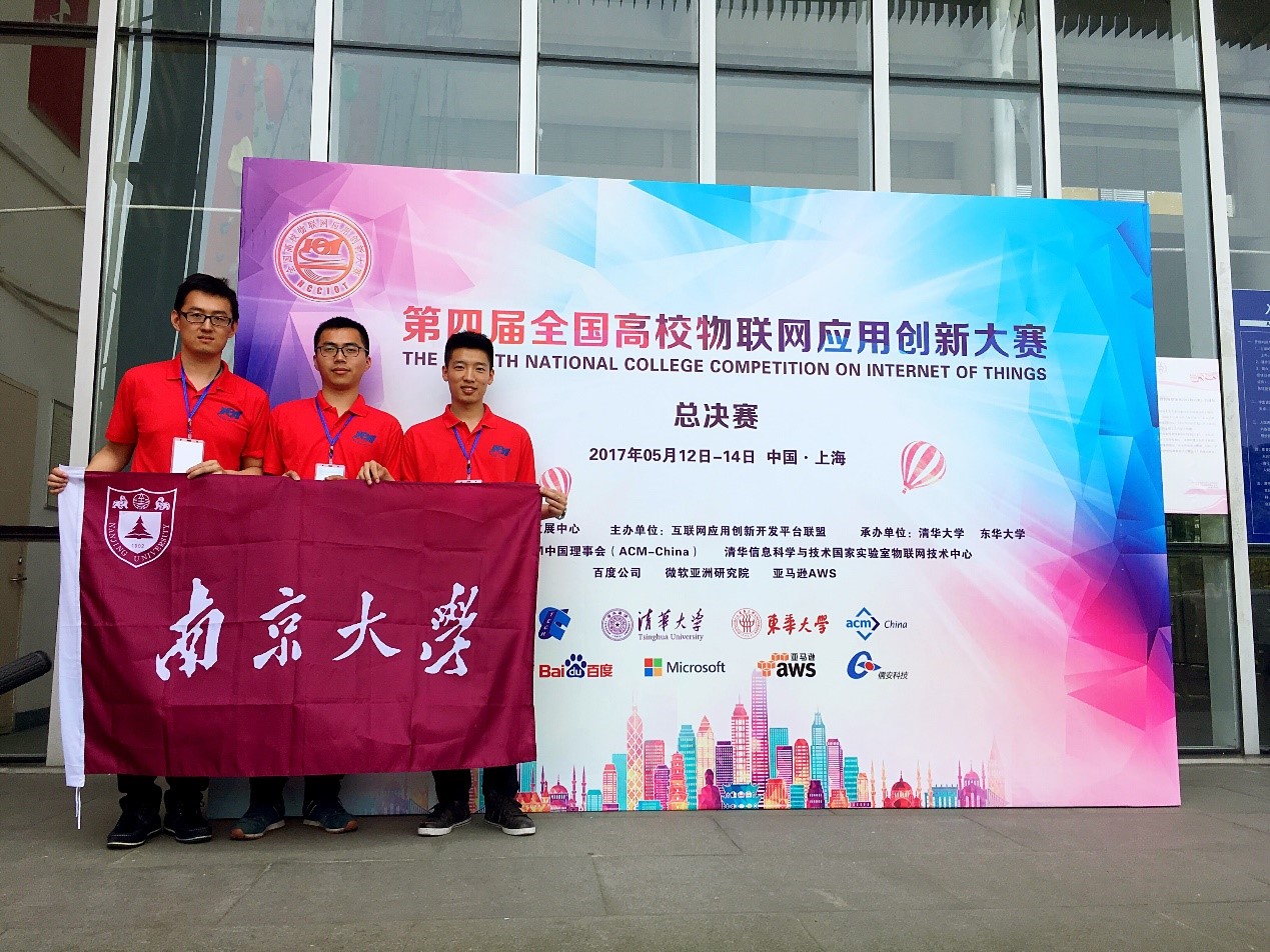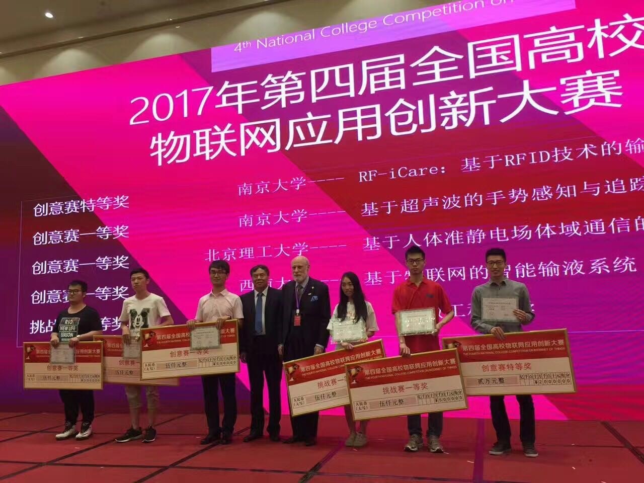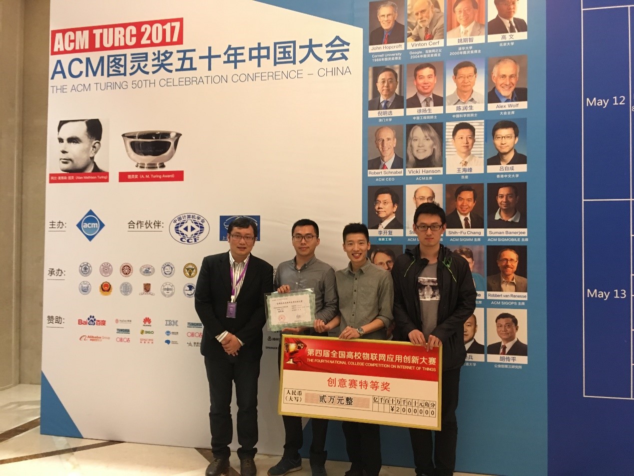 2017年5月12 – 14日,由教育部科技发展中心主办的第四届全国高校物联网应用创新大赛创意赛全国总决赛在东华大学图文信息大楼第一报告厅成功举办。我系分布式计算团队(成员:何兵兵,张柯岩,陆逸嘉;指导教师:谢磊)凭借“RF-iCare:基于RFID技术的输液监测系统”,从全国七大赛区1050只队伍中脱颖而出,获得第1名的优异成绩,夺得创意赛全国特等奖。我系团队(成员:孙珂、凌康;指导教师:戴海鹏)凭借“基于超声波的手势感知与追踪”的项目夺得总决赛第2名和一等奖(其中特等奖一名,一等奖三名,二等奖六名)。谢磊和戴海鹏作为团队指导教师分别获得最佳指导教师奖。在ACM图灵奖五十年中国大会的庆功晚宴暨赛事颁奖典礼上,图灵奖获得者、互联网之父Vinton Cerf和教育部科技发展中心李志民主任参与颁奖典礼,并颁发特等奖和最佳指导老师奖奖牌。出席者还包括图灵奖获得者John Hopcroft,ACM主席Vicki Hanson,ACM Fellow、IEEE Fellow、清华大学软件赌场老虎机 院长刘云浩等。此次总决赛的参赛队伍共有从七大赛区选拔出来的包括南京大学、清华大学、武汉大学、哈尔滨工业大学、华中科技大学、西安交通大学等在内的42所高校75支参赛队伍。