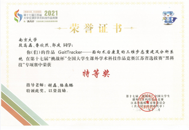 GaitTracker步态分析系统经过我系谢磊教授、陆桑璐教授的悉心指导,由计算机系学子独立设计完成,并不断进行系统的迭代优化,此前凭借创新型的平台已斩获多项系统类的荣誉:在2021年第十七届“挑战杯”全国大学生课外学术科技作品竞赛过程中,取得黑科技专项赛国赛“行星”级作品、江苏省赛特等奖;2021年中国高校计算机大赛-网络技术挑战赛华东赛区一等奖。