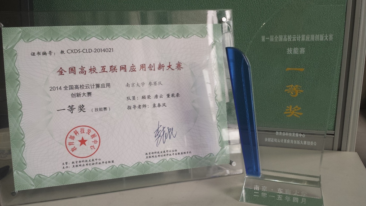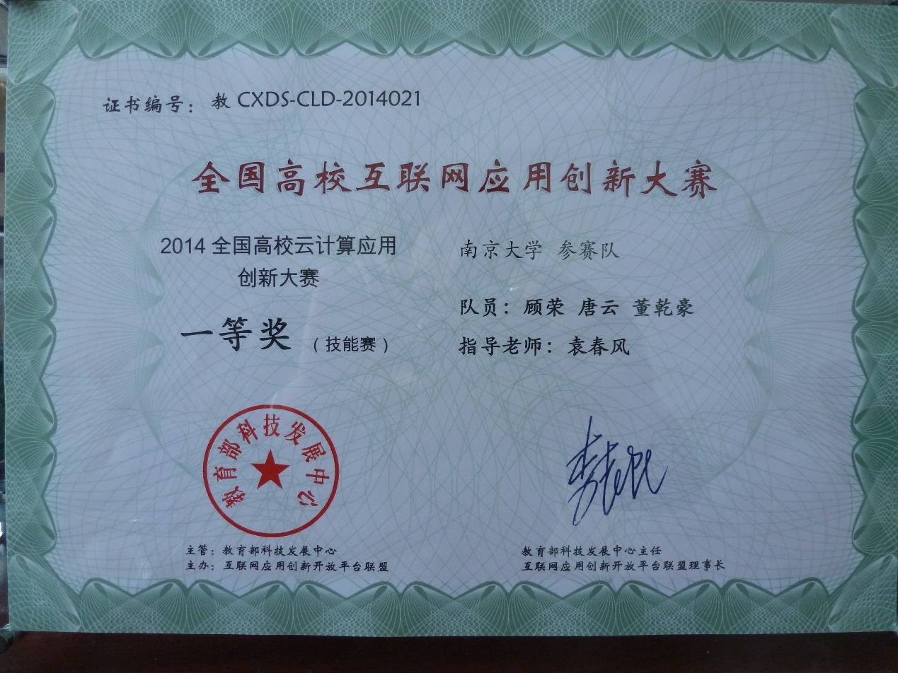 第一届“全国高校云计算应用创新大赛”经过半年多的赛程,于2015年4月22日在东南大学落下帷幕。我系PASA大数据实验室由顾荣、唐云和董乾豪三位同学组建、袁春风老师指导的NJU-PASA队,经过预赛、复赛和总决赛三轮角逐,最终脱颖而出,在全国500多支参赛队伍中,获得技能赛第1名的优异成绩,荣获大赛一等奖!