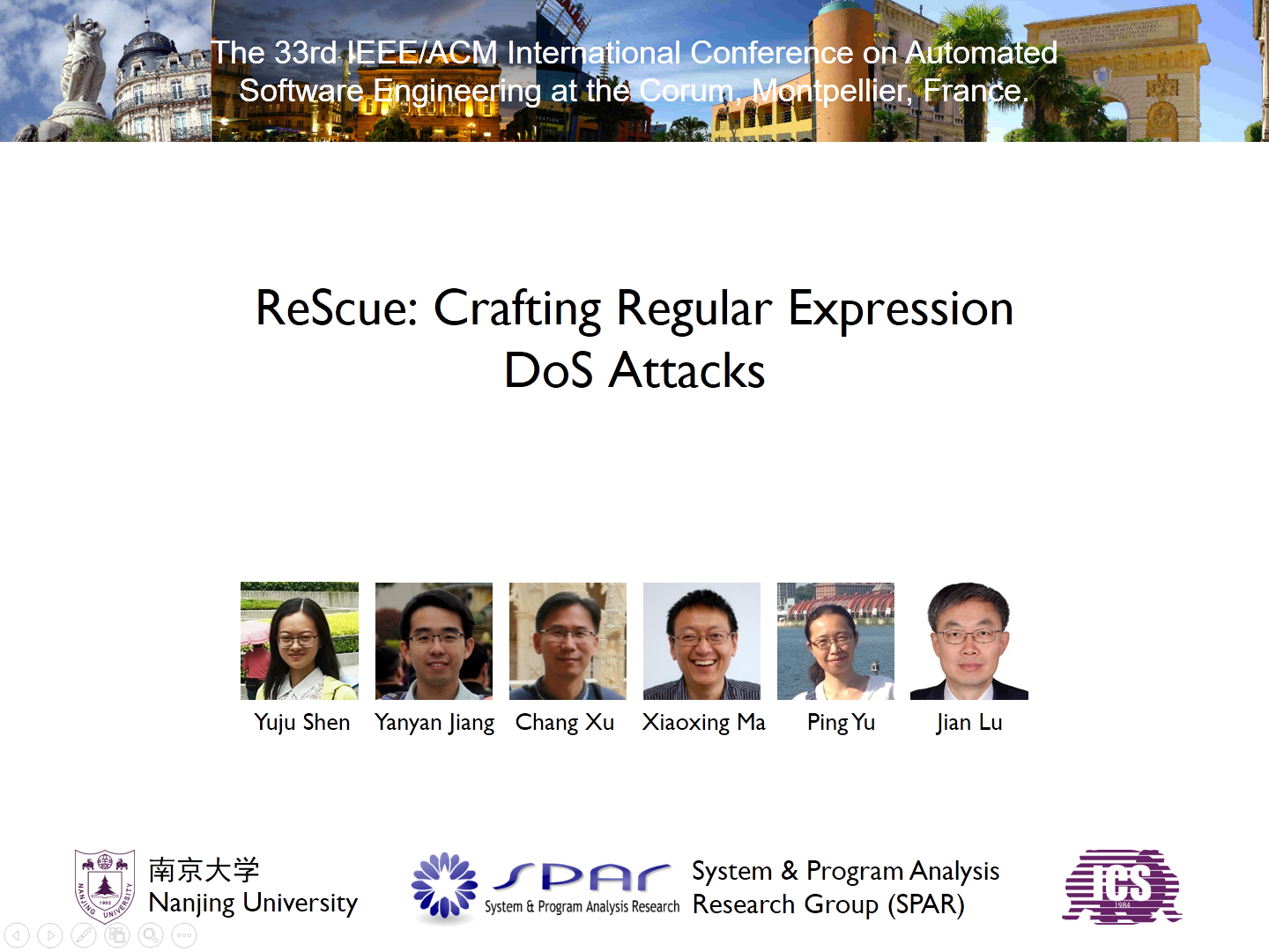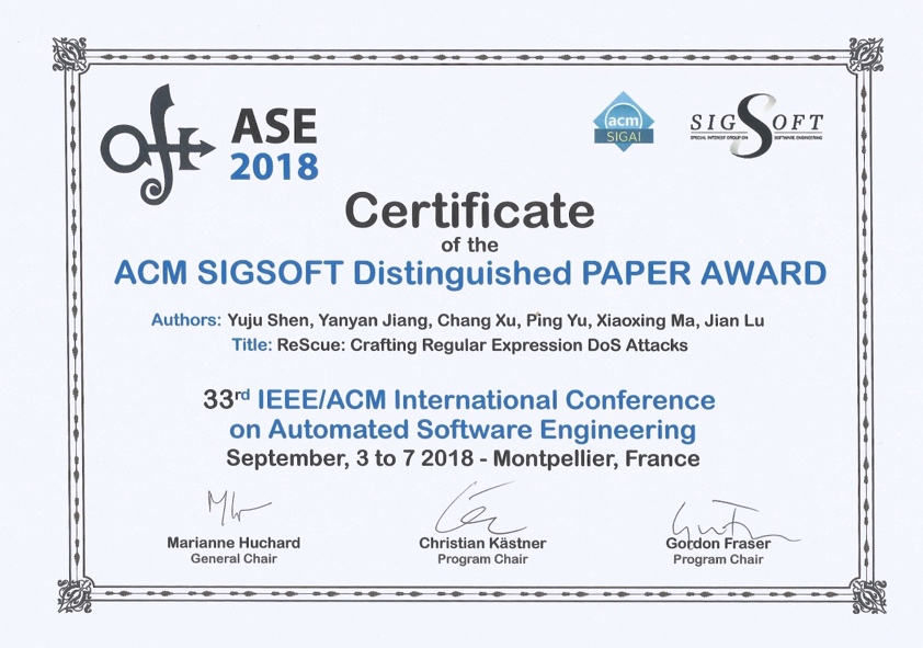 2018年9月3日至7日,第33届IEEE/ACM International Conference on Automated Software Engineering(ASE 2018)在法国蒙彼利埃举行,南京大学计算机软件研究所由蒋炎岩博士具体指导的硕士研究生沈宇桔的论文“ReScue: Crafting Regular Expression DoS Attacks”荣获本次会议的ACM SIGSOFT Distinguished Paper Award。该论文由南京大学独立完成,并在该会议上首次获得杰出论文奖的突破。