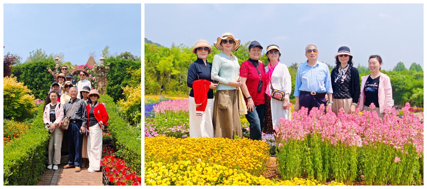 为方便住居在龙江小区和鼓楼周边的老同志就近上车设置两个接送点, 清晨8:00,大巴从鼓楼公园集合出发,沿途欢声笑语。一个半小时车程后抵达国家4A级景区"花谷奇缘".。老同志们漫步千亩花田,在玫瑰花、鲁冰花等特色花卉组成的缤纷画卷中,感受生态旅游与现代农业融合发展的创新实践。 大家三五成群沉浸在花海中拍照留念,流连忘返。