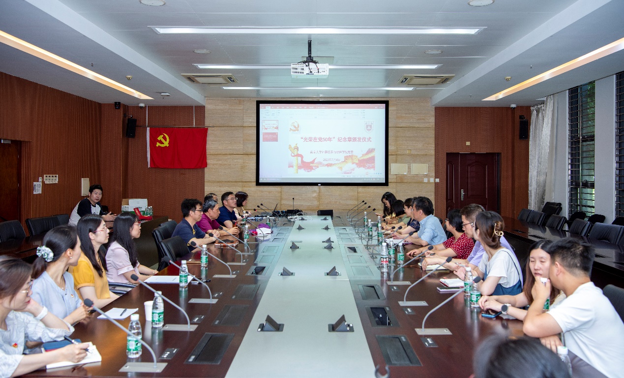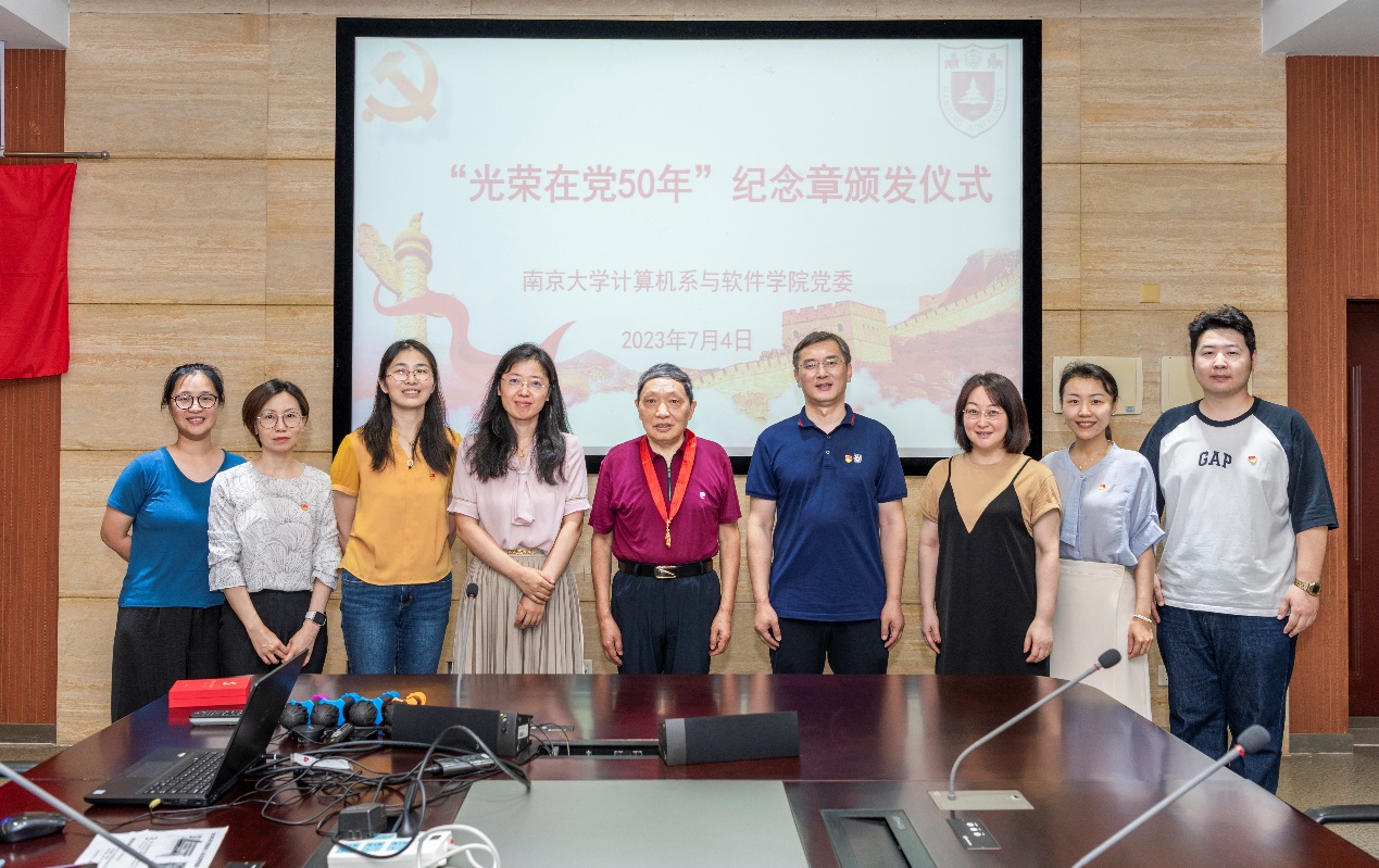 本次活动恰逢计算机系办公室支部赵金熙老师获颁光荣在党五十年纪念奖章。武港山书记为赵老师颁发了纪念章。赵老师回顾了自己在党五十年的历程,讲述了在求学、任教期间亲身经历的个人命运与学校发展、国家大事紧紧交织的多个案例,展现了共产党员在复杂环境下坚持真理、勇于斗争的优良品质和心系国家的家国情怀。计算机系办公室支部书记张剡向赵老师表示祝贺,感谢其长期以来对支部建设所做的贡献,并祝赵老师身体健康,继续关心支持支部工作。