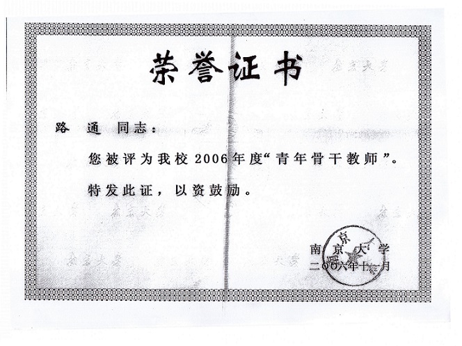 17. Selected as the First-round Talented Young Scholar of Nanjing University, 2006