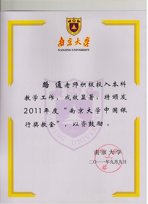 10. Won the Second "Bank of China" Teaching Award in Nanjing University, 2011