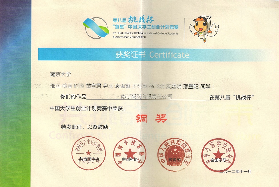 6. As the supervisor, my innovation team respectively won the Bronze Prize of the Seventh "Colledge Cup" and the Golden Prize of the Eighth "Colledge Cup" of Chinese College Students of Academic Science and Technology at China and Jiangsu Province, which is the highest level contest for graduate and undergraduate students in China, 2012