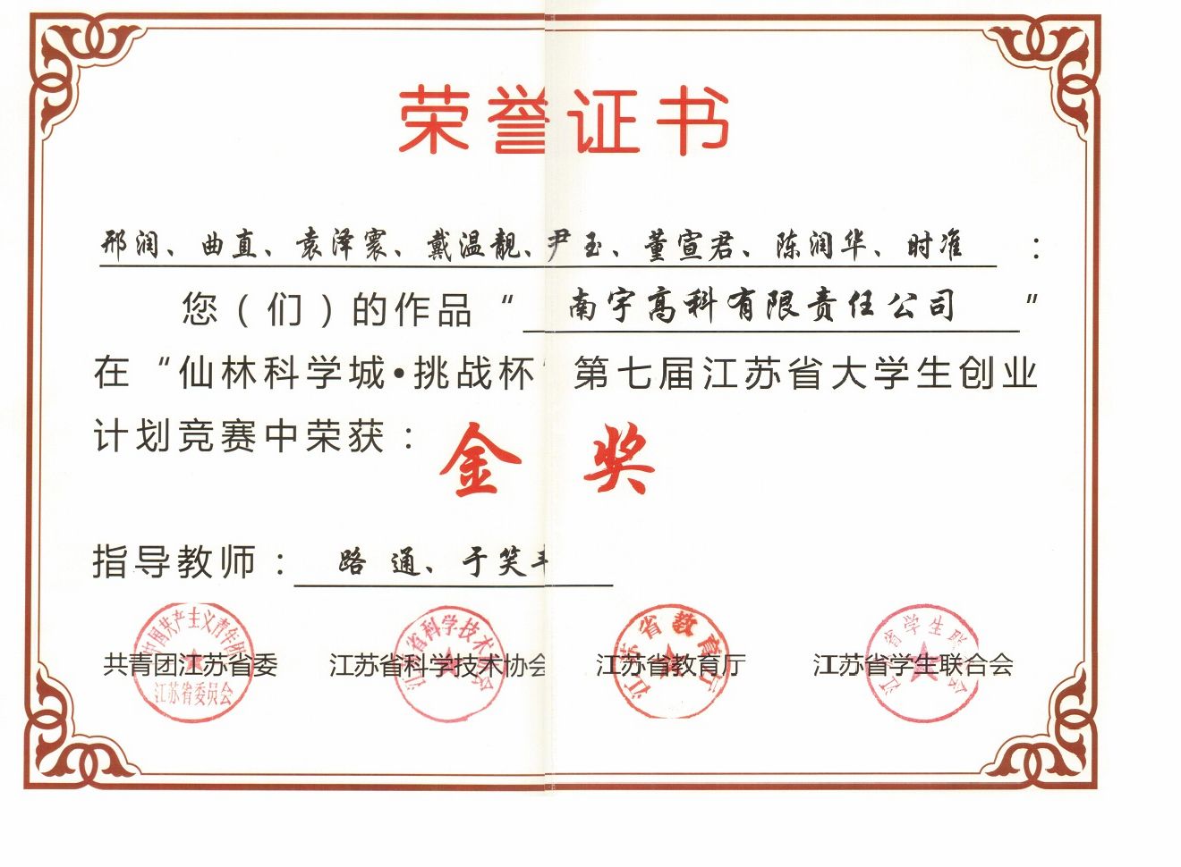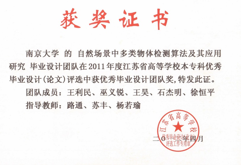 9. As the 1st supervisor, the thesis titled "Research on Multiclass Object Detection Algorithm and Its Applciations" won the First Prize of Excellent BSc Thesis Team of Jiangsu Province (The first team won this award in the Dept. of Computer Science and Technology, Nanjing University), 2011