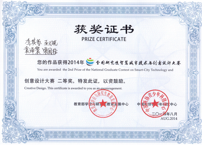 1. Awarded by the National Intelligent City contest for graduate students in China (the second prize), 2014